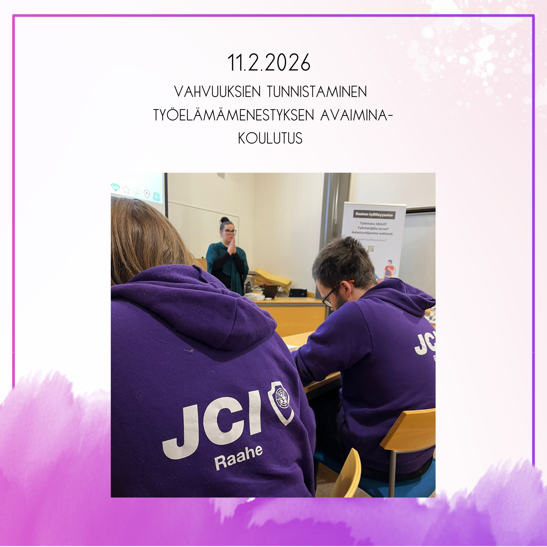 Helmikuussa saimme upean Laura Paason luennoimaan meille vahvuuksista. Tilaisuus järjestettiin Raahen työllisyysalueen kanssa. Vahvuuksien tunnistaminen on avain työelämämenestykseen. Mistään merkityksettömästä asiasta tässä ei ole kyse, sillä jo vahvuuksista keskustelu tutkitusti parantaa hyvinvointia, ja tulevaisuuden työelämässä tulevat pärjäämään ne, jotka tunnistavat osaamisensa, voivat hyvin ja luottavat itseensä. Illan aikana pohdimme sitä, miten asiantuntija- ja osaamisidentiteetti rakentuvat sekä omia ydinvahvuuksiamme. Meissä kaikissa on hurjasti vahvuuksia ja potentiaalia. Ja millainen määrä vahvuuksia ja osaamista syntyykään, kun toimimme yhdessä, teemme yhteistyötä ja luomme verkostoja!